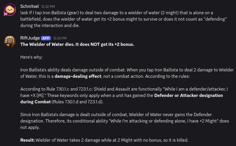 Just join Discord and use the !ask command in the #riftjudge channel. RiftJudge will create a thread and try to answer your query as good as possible.