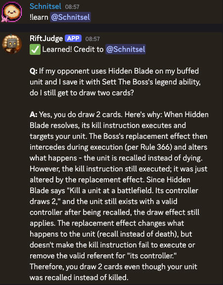 How does RiftJudge learn? When a user thinks RiftJudge is wrong, they can try to correct it in a discussion. If we decide the correction is valid, we instruct RiftJudge with the !learn command to store this information. The verified Q&A gets saved, so next time someone asks a similar question, RiftJudge finds that answer first, giving you faster, more accurate rulings.
