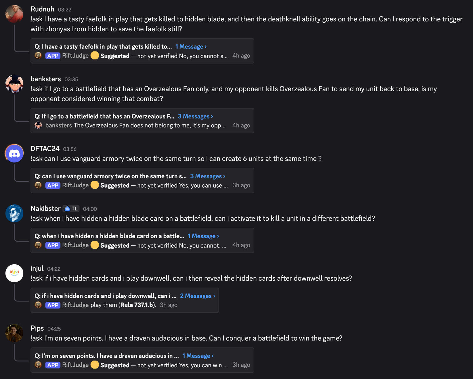 Just join Discord and use the !ask command in the #riftjudge channel. RiftJudge will create a thread and try to answer your query as good as possible.
